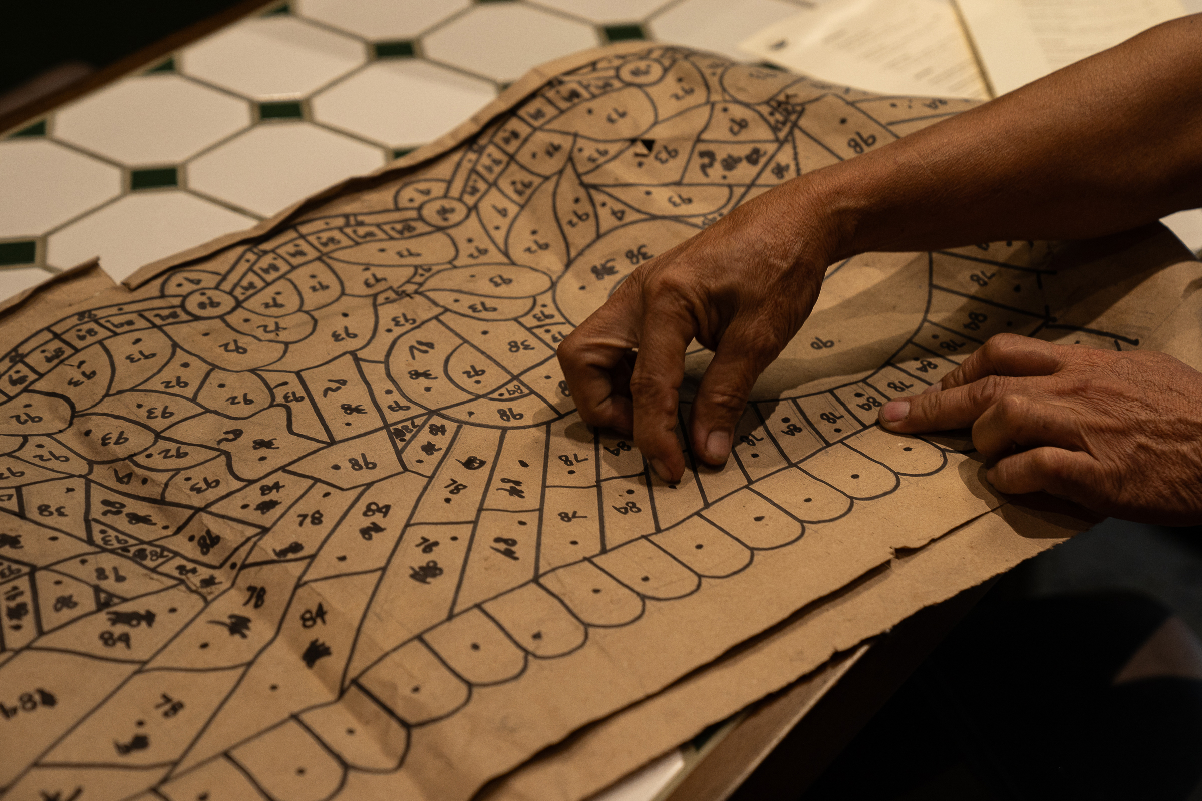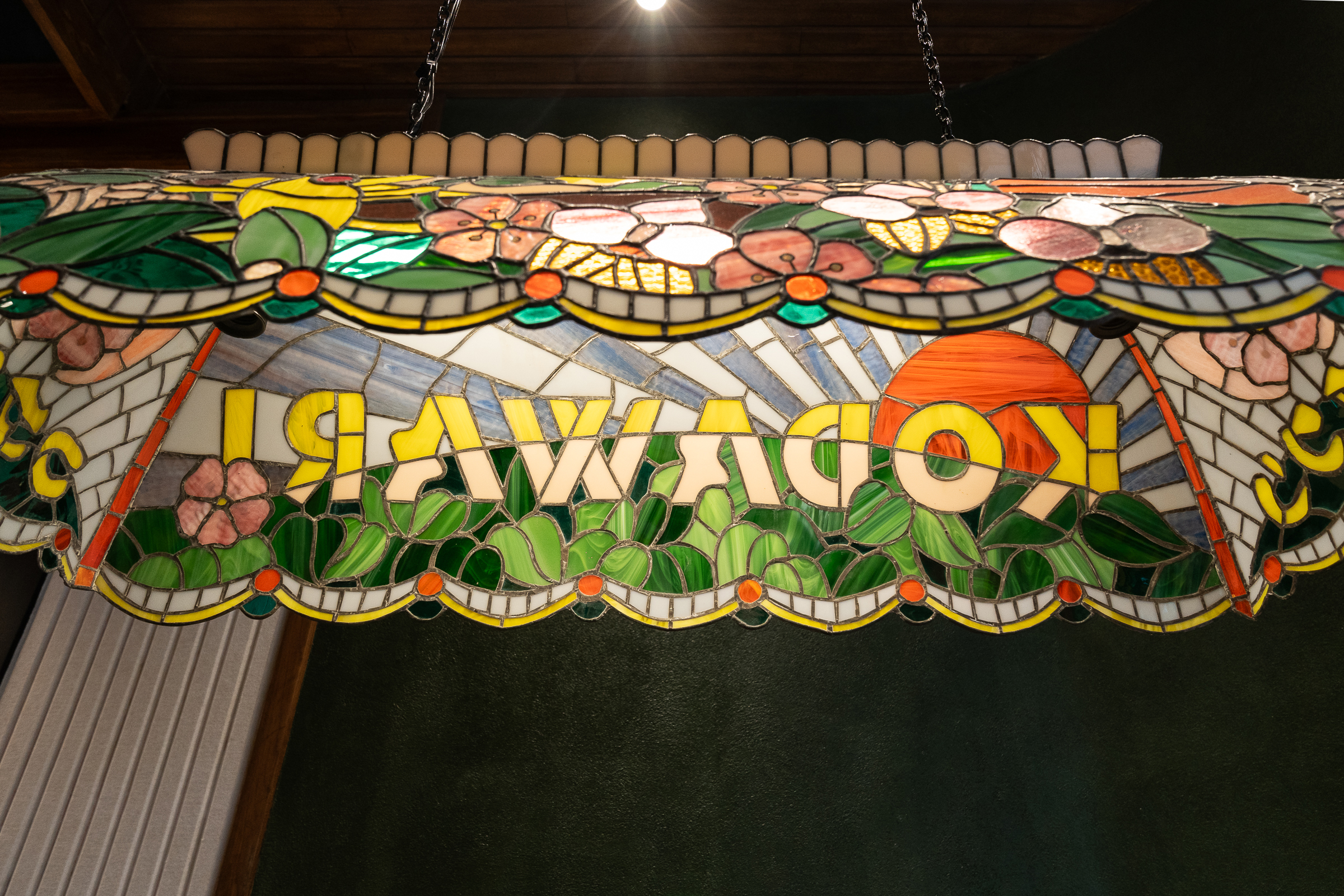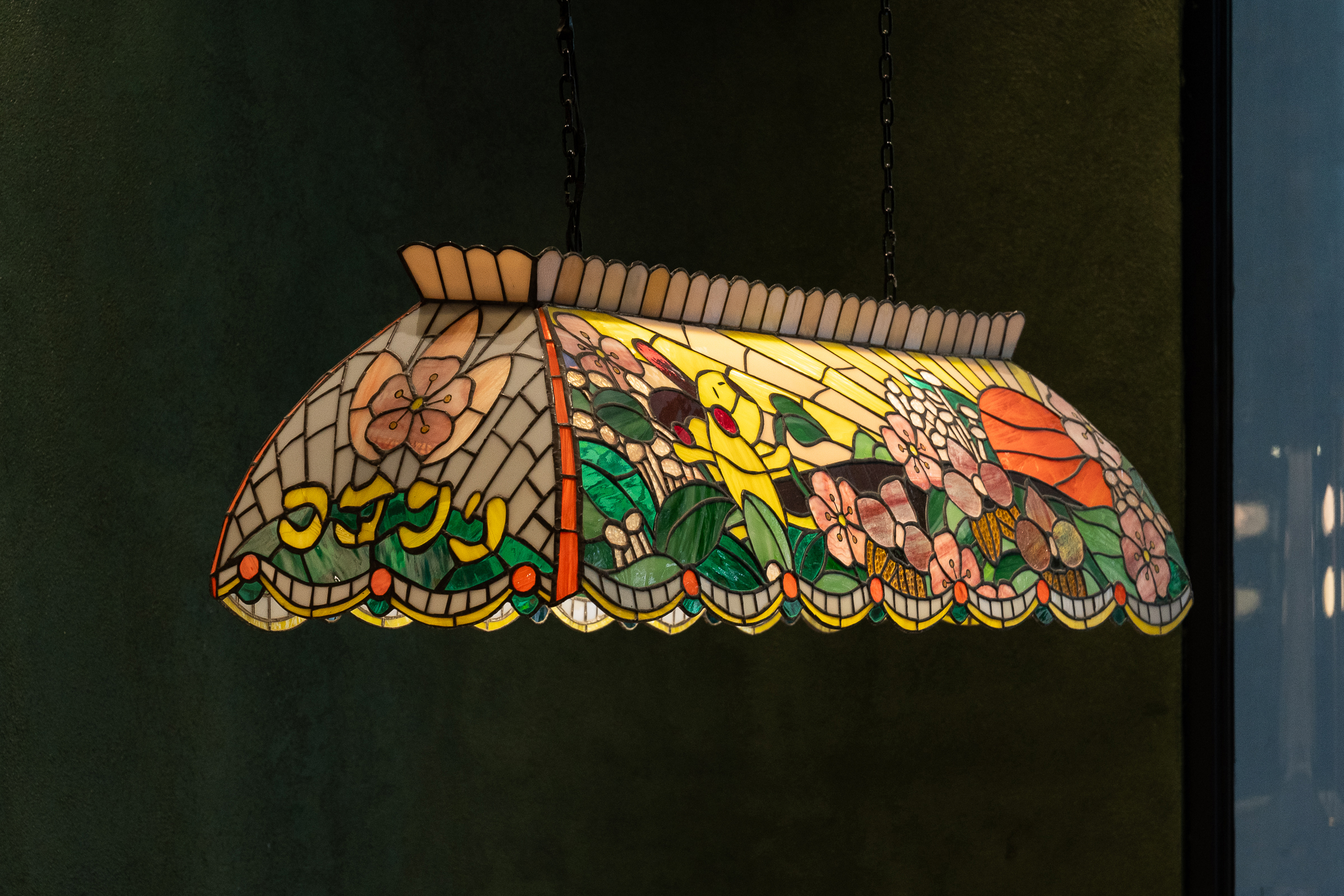 Designed by Raxenne Maniquiz and fabricated by the Tiffany Stained Glass team. A visual translation of Kodawari’s trays, this custom billiards table lamp features over 700 handcut glass pieces.