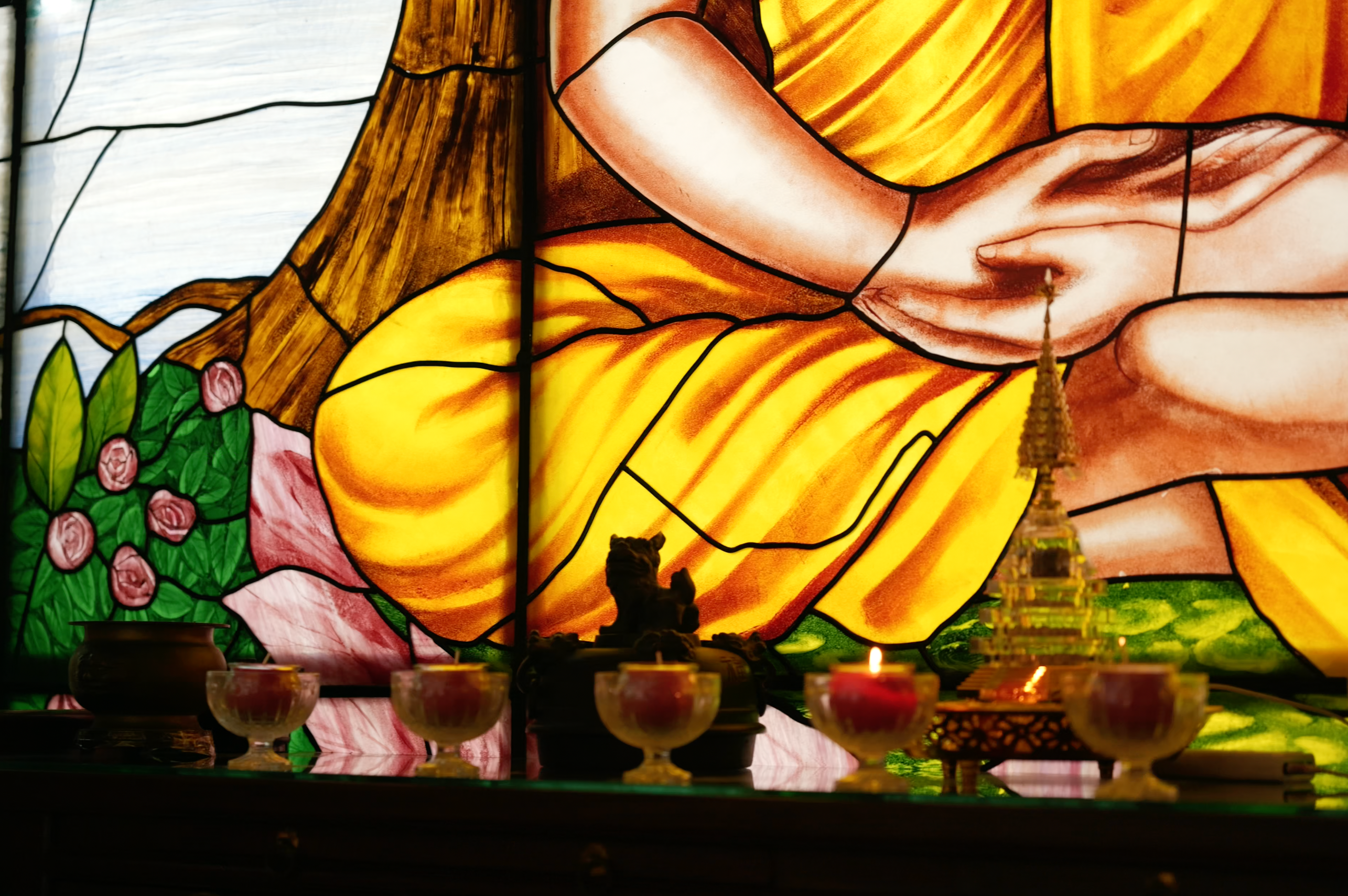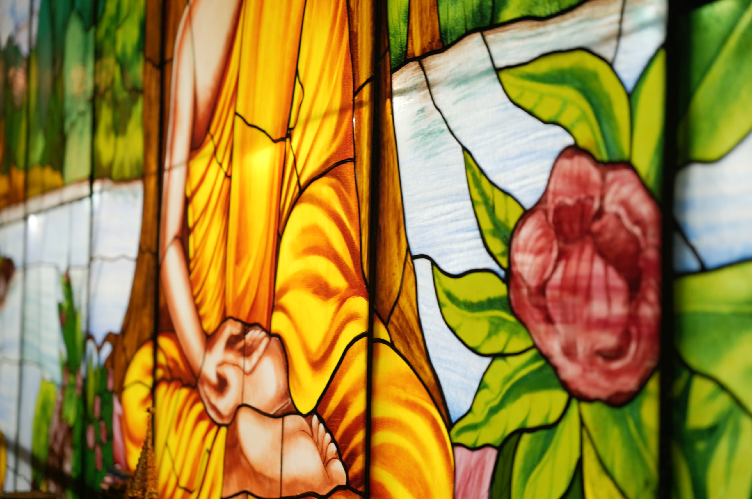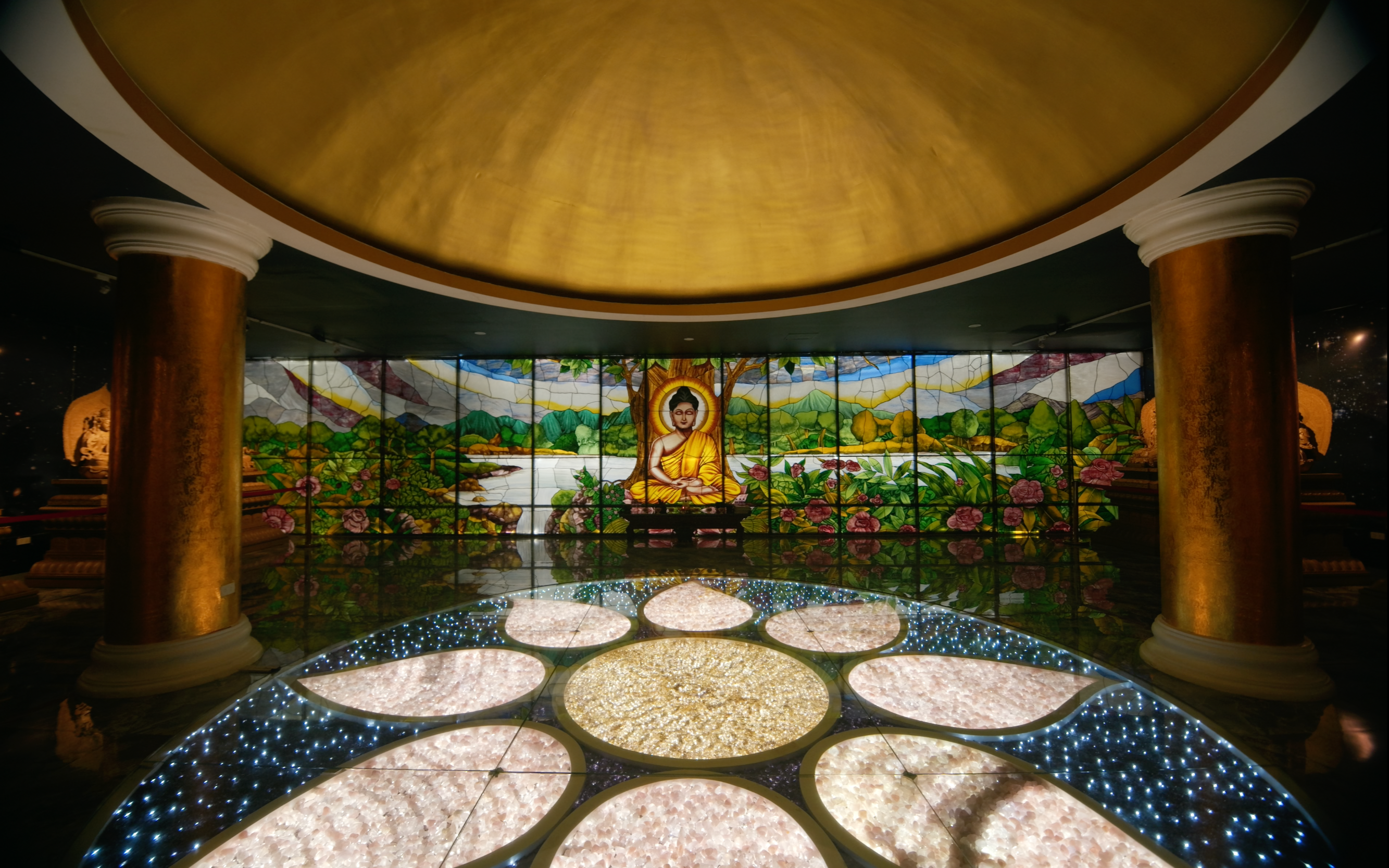 Located in Quezon City, the hand-painted and hand-stained panels by TSG depict Buddha meditating under a Bodhi tree. It faces a specially lit glass floor encased with precious stones where visitors can lay on and meditate.